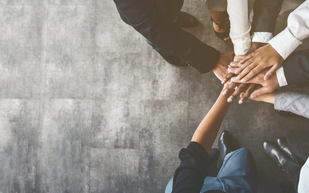 Business people putting their hands together, top view